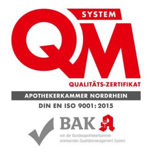 Wir führen das Qualitätssiegel der Bundesapothekerkammer. Dies bedeutet, dass wir nach genau festgelegten Abläufen arbeiten, um eine gleichbleibend hohe Qualität unserer Dienstleistungen sicherzustellen. Außerdem stellen wir uns regelmäßig externen Überprüfungen.